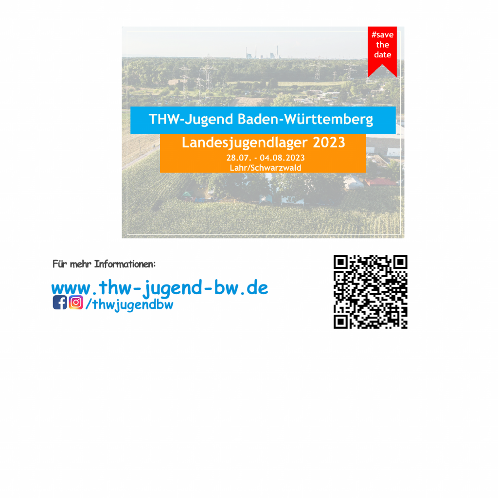 Landesjugendlager 2023 -Endlich wieder nach fünf Jahren Pause!Wir haben gute Nachrichten für euch! Die Organisation des Landesjugendlagers 2023 läuft derzeit auf Hochtouren! Das Landesjugendlager der THW-Jugend Baden-Württemberg e.V. findet in der Regel alle drei Jahre statt und knackt dabei jedes Mal aufs Neue Rekorde. Die 500 jungen und junggebliebenen Teilnehmenden aus 37 verschiedenen Jugendgruppen aus dem gesamten Bundesland besiedeln eine Woche das Lagergelände. Mit Ausflügen, verschiedenen Freizeitaktivitäten und gemeinschaftlichen Aktionen ist das Landesjugendlager der ideale Auftakt für die Sommerferien. Das Highlight ist dabei der Landesjugendwettkampf, der im Zuge des Lagers stattfindet. Über 10 hochmotivierte Jugendgruppen kämpfen um den heiß begehrten Landessieg. Die Siegermannschaft wird die THW-Jugend Baden-Württemberg beim nächsten Bundeswettkampf vertreten, um die Mission „Bundessieg in‘s Ländle“ zu starten.
