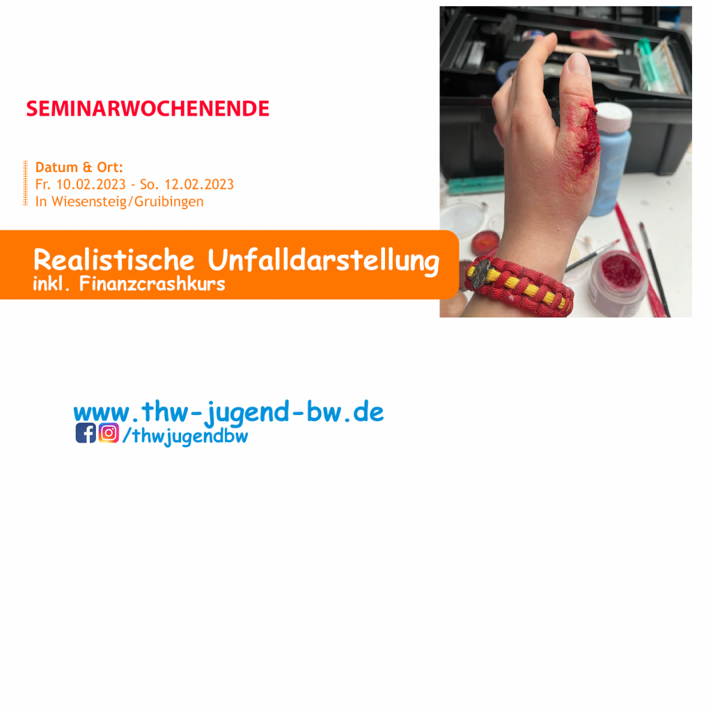 Hier wird der Ernstfall möglichst realitätsnah dargestellt. Seminarwochenende in PräsenzRealistische Unfalldarstellung inkl. Finanzcrashkursmit Tobias Hilbers und Celine Sieck Fr. 10.02.2023 bis So. 12.02.2023In Wiesensteig/Gruibingen Kurs-Bezeichnung: Seminarwochenende 02/2023 Hier sind alle notwendigen Informationen für dich zusammengefasst: In diesem Workshop wird der Ernstfall möglichst realitätsnah dargestellt. Hier lernst du unter Anleitung, wie man mithilfe eines Schminksets unterschiedliche Arten von Wunden (wie Schürf-/Riss-/Platzwunden uvm.) schminkt. Ablauf: Gestartet wird am 10.02.2023 mit einem gemeinsamen Abendessen (Anreise bis 18:00 Uhr), im Gasthof Selteltor in Wiesensteig. Der Lehrgang findet bis zum 12.02.2023 gegen 13:00 Uhr statt und endet mit einem gemeinsamen Mittagessen. Da das Seminar “Berechtigte Personen für die Abname des Leistungsabzeichens” parallel stattfindet, bietet es sich an Fahrgemeinschaften zu bilden. Ebenfalls wird ein gemeinsamer Austausch mit den Teilnehmenden dieses Seminars möglich sein. Inhalte des Seminars: Realistische Unfalldarstellung Wer kann sich anmelden?Ortsjugendbeauftragte; Ortsjugendleiter/-innen, Tätige in der Jugendarbeit. Ab 18 Jahren – Max. 10 Teilnehmer/-innenKein Problem mit Blut. Empfehlung: – nicht die schönste bzw. Lieblingskleidung tragen, werden ggf. dreckig.– ggf. sich rasieren (Gesicht/Unterarm) – macht das Entfernen der Schminke/Verletzungen einfacher. Bis wann kann ich mich anmelden?– wird rechtzeitig bekannt gegeben – Wo muss ich hin?Gasthof SelteltorWesterheimer Str. 373349 Wiesensteig Wer sind meine Ansprechpartner/-innen?Kursleiter und Kursleiterin: Tobias Hilbers und Celine SieckOrganisatorische Anfragen an: tobias.hilbers@thw-jugend-ludwigsburg.deoder monika.hordes@test2.landeszeltlager.de Wir freuen uns riesig euch an dem Seminarwochenende kennenzulernen! Tobias Hilbers und Celine Sieck THW-Jugend Baden-Württemberg