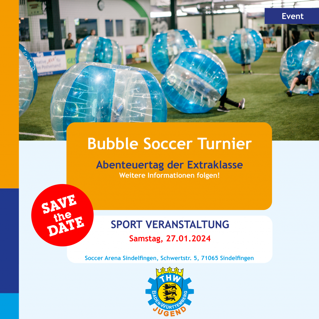 Das Ultimative THW-Jugend Bubble-Soccer Event findet in Sindelfingen am 27. Januar 2024 statt! Freut euch auf ein unvergessliches Erlebnis voller Spaß und Teamgeist! Trefft eure THW-Kamerad:innen und spielt Fußball in transparenten Bubblebällen. ?‍♂ ? Datum: 27. Januar 2024 ? Ort: Sindelfingen