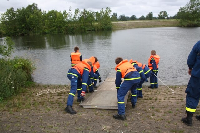 Anschließend ging es an den praktischen Teil. Die Prüflinge wurden Einzel getestet. Insgesamt gab es sieben Aufgaben zu lösen, die auf drei Stationen verteilt waren. Die Jugendlichen zeigten ihr Können im Umgang mit Leitern, danach hatten sie die Aufgabe einen Leinenstropp zu binden, um einen Klappkloben daran hängen zu können. Bei der nächsten Station wurden die Dienststellungskennzeichen abgefragt und eine weitere Aufgabe bestand im Einbinden einer verletzten Person auf die Krankentrage.
