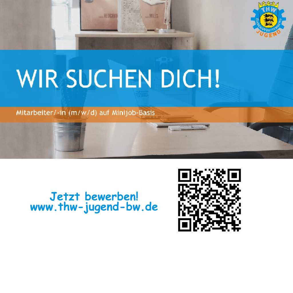 Wir suchen ab sofort: Eine/n Mitarbeiter/-in (m/w/d) auf Minijob-Basis Stand: Juni 2022, Ansprechperson: Larissa Ziegler (landesgeschaeftsstelle@test2.landeszeltlager.de) d Die THW-Jugend Baden-Württemberg e.V. ist der Jugendverband des Technischen Hilfswerks in Baden-Württemberg. Sie übernimmt als Landesjugend die Koordination der ehrenamtlichen Jugendarbeit für rund 2000 Kinder und Jugendliche in 94 Ortsjugenden. Wir suchen ab sofort für unser Büro in Stuttgart – mit Möglichkeit zur mobilen Arbeit – eine/n Mitarbeiter/in auf Minijob-Basis. d