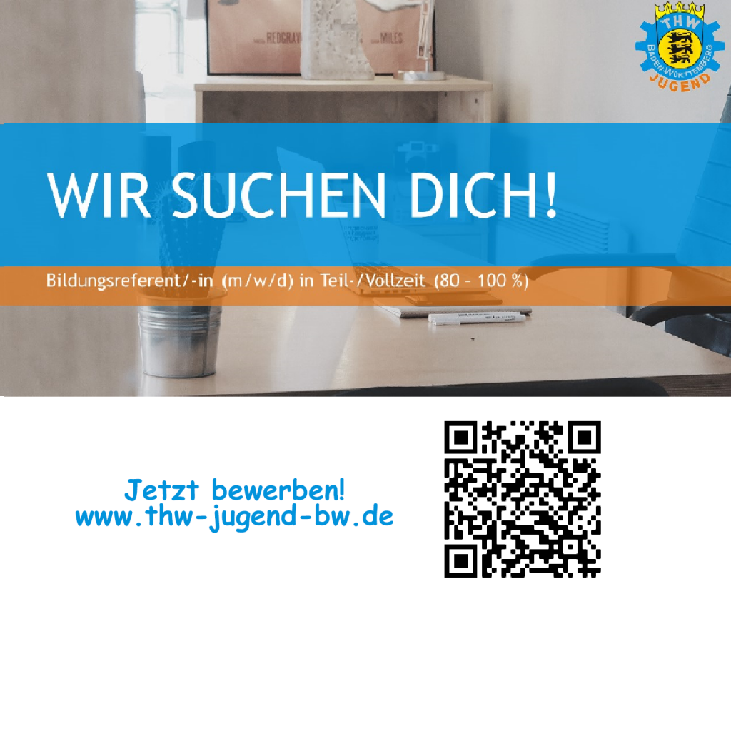 Wir suchen ab sofort: Eine/n Bildungsreferent/-in (m/w/d) in Teil-/Vollzeit (80 – 100 %) Stand: Juni 2022, Ansprechperson: Larissa Ziegler (landesgeschaeftsstelle@test2.landeszeltlager.de) d Die THW-Jugend Baden-Württemberg e.V. ist der Jugendverband des Technischen Hilfswerks in Baden-Württemberg. Sie übernimmt als Landesjugend die Koordination der ehrenamtlichen Jugendarbeit für rund 2000 Kinder und Jugendliche in 94 Ortsjugenden. Wir suchen ab sofort zunächst befristet bis zum 31.12.2023 für unser Büro in Stuttgart– mit Möglichkeit zur mobilen Arbeit – eine Bildungsreferentin/einen Bildungsreferenten in Voll-/Teilzeit (80 – 100 %). d