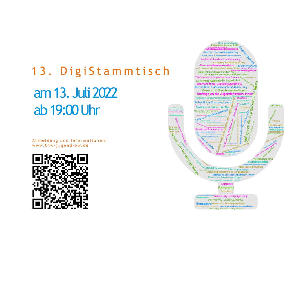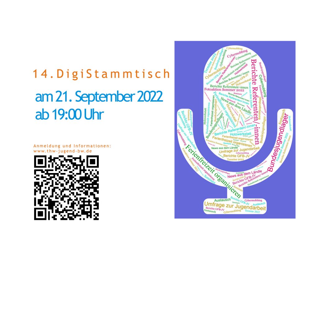 Wir laden Dich hiermit zum 14. DigiStammtisch am 21. September 2022 ab 19:00 Uhr ein! Du bist Ortsjugendleiter*in und / oder Ortsjugendbeauftragte*r aus Baden-Württembergoder in der THW-Jugendarbeit aktiv,dann melde Dich zum 14. DigiStammtisch hier und jetzt an! d Jetzt anmelden! Bis spätestens Di., 20.09.2022 um 16:00 Uhr! d Programm: Fotoaktion Sommer 2022: Aktueller Stand und Informationen Ergebnisse der Umfrage zur Jugendarbeit Seminare:Cybermobbing – Anmeldung läuft bereits!Freizeitlager organisieren – Anmeldung startet demnächst!Holzwerkstatt – Anmeldung startet demnächst! Berichte: Referenten/-innenGFB-Jugendvertreter/-innen Termine 2022 Fragen und Austausch zum Bundesjugendlager News aus dem Ländle Angebote und Zeit für Austausch Natürlich gibt es auch wieder aktuelle Informationen zu allen anderen Themenrund um Eure Jugendarbeit. Informationen: Wann geht es los?Mittwoch, 21.09.2022, ab 19:00 Uhr Wo musst Du hin?Wenn Du willst, ganz bequem von Deiner Couch aus oder wo immer Du gerade bist! Was brauchst Du dafür?Alles was Du benötigst ist ein Smartphone, Tablet oder einen PC und einen Internetzugang. Mit uns kannst Du über Deine aktuellen Themen und mehr diskutieren oder auch schweigen und einfach nur zuhören! Melde Dich bis spätestens Dienstag, 20.09.2022 um 16:00 Uhr an,damit wir Dir den Zugangslink zusenden können.Du erhältst dann auch noch weitere Details zum DigiStammtisch(wie z. B. geeignete Einstellung im Browser etc.) Und dann heißt es erneut:Herzlich Willkommen im DigiStammtisch!