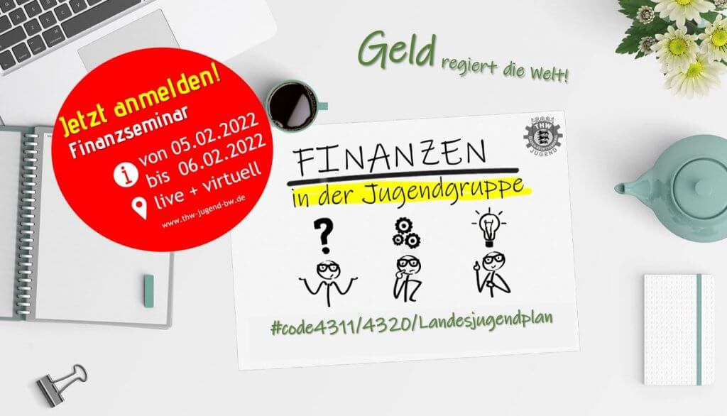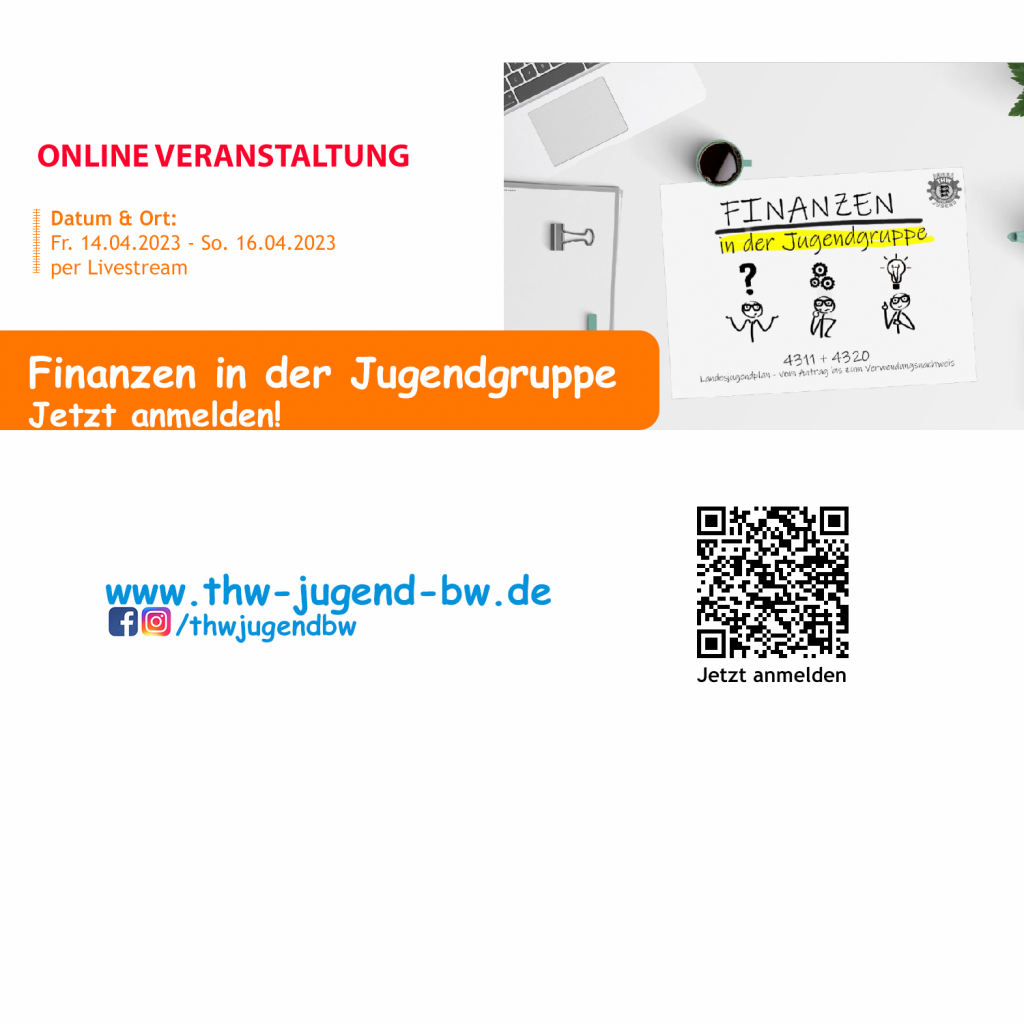 Herzliche Einladung zum Seminar Finanzen in der Jugendgruppe Mit voller Energie und viel Motivation starten wir in das neue Jahr 2023 mit dem Seminar zum Thema Finanzen in der Jugendgruppe. Inhalte: Nähere Infos: landesgeschaeftsstelle@test2.landeszeltlager.de Informationen Wer: Mitglieder der THW Jugend Baden Württembergund alle Interessierte der Jugendarbeit im THW Achtung, die Plätze sind begrenzt! Wann:Am 14.04.2023, Beginn: ab 18:00 UhrBis 16.04.2023, Ende: ca. 14:00 Uhr Wo:Livestream! Jetzt anmelden! Kurs-Bez.: Finanzseminar 04/2023 d Anmeldeschluss: Mi., 12.04.2023 bis 16:00 Uhr